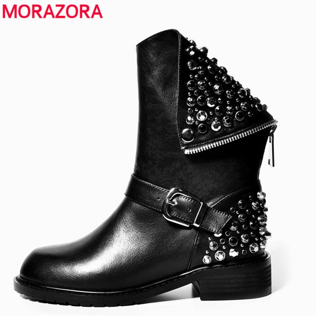 MORAZORA Plus Size 35-43 Genuine Leather Boots Women Rivets Autumn Winter Ankle Boots Punk Ladies Motorcycle Boots Shoes
